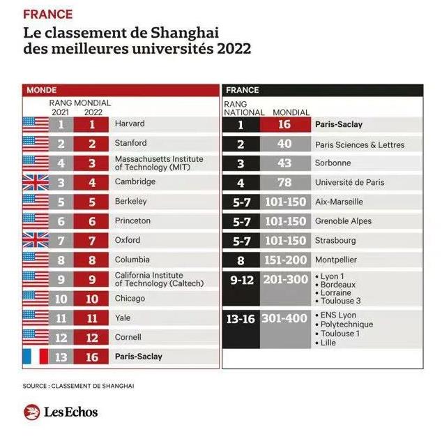 法国《回声报》(Les Echos)报道,8月15日,位于上海的高等教育评价机构软科正式发布“2022软科世界大学学术排名”。该排名根据六项指标制定,已成为评判大学在全球吸引学生的竞争水平参考。在新版排名中,有4所法国学校成功跻身前100强,不过,相比去年,这4所学校的名次均有所下滑。