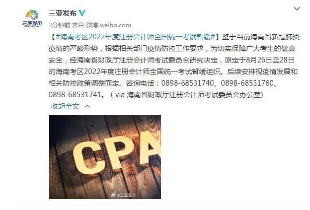 【#海南考区2022年度注册会计师全国统一考试暂缓#】鉴于当前海南省新冠肺炎疫情的严峻形势,根据相关部门疫情防控工作要求,为切实保障广大考生的健康安全,经海南省财政厅注册会计师考试委员会研究决定,原定于8月26日至28日的海南考区2022年度注册会计师全国统一考试暂缓组织。后续安排视疫情发展和相关防控政策调整而定。咨询电话:0898-68531740、0898-68531760、0898-68531741。(via 海南省财政厅注册会计师考试委员会办公室)